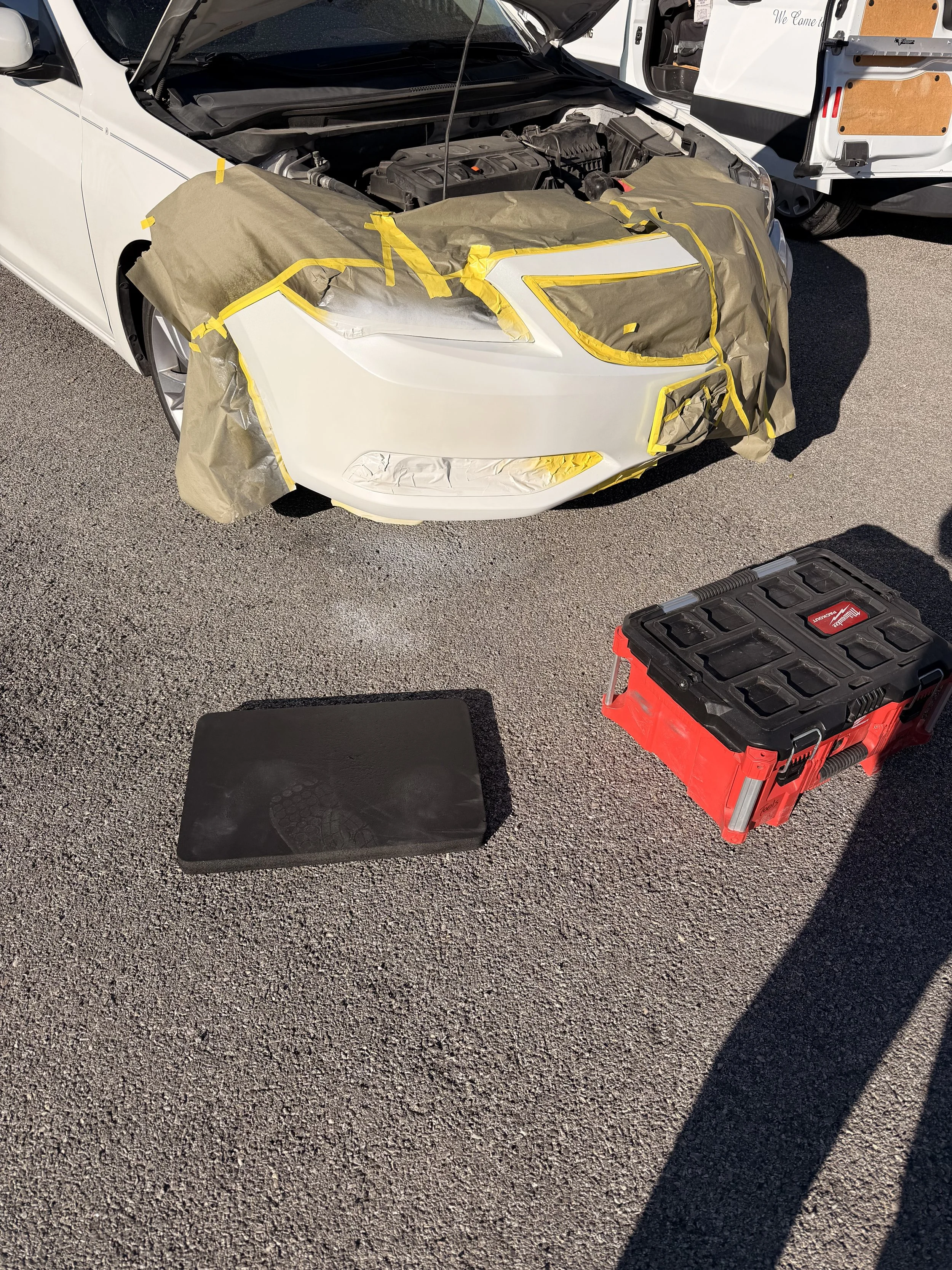 Preparation: For scratches or deep scuffs, the area is sanded, if the bumper is dented, cracked, heat and fillers are used to remedy the damage.